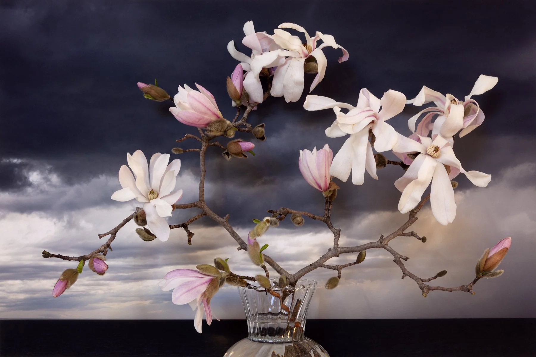 I begin with a few stems with buds or flowers or just leaves, choose a vase and look through my photographs of Prince Edward Island (my homeland), images I made not long ago of the sea or rolling hills and sky: I depend on the natural light from my studio windows that creates reflections and shadows. These are what I work with like a stage set to make a photograph. I work on the composition, trying out different background images and arrangements, getting all the parts just right, while meaning brews subconsciously. And though I don’t fully understand it, a story reveals itself, even though it has neither an end nor clear beginning.